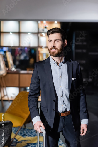 happy, business, travel, smiling, adult, cheerful, caucasian, handle, man, emotion, suit, hold, businessman, racked, joyful, indoor, tour tourism, profession, photogenic, baggage, baggage, trip, pleased, holiday maker, lobby, suitcase, hotel, traveler, bearded, antechamber, blazer, one person