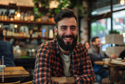 Bearded man sitting in a cozy cafe, smiling at the camera