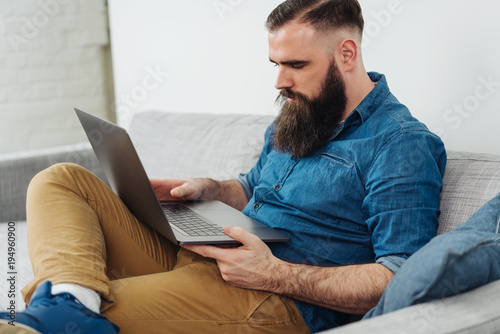 man, computer, couch, home, lifestyle, 20s, adult, apartment, attractive, browsing, business, casual attire, caucasian, comfortable, communication, connection, domicile, guy, homelike, house, indoor, interior, cyberspace, laptop, leisure, living room, male, modern, notebook, 1, online, people, person, room, sitting, sofa, technology, using, web, white, wireless, working, young, beard, hipster, style