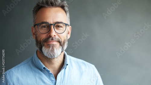 Bearded man with glasses in a light blue shirt against a gray background, captured from a frontal perspective.