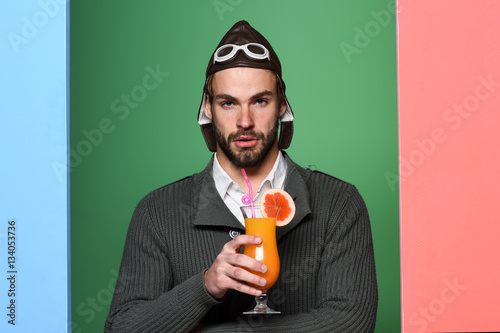 man, photogenic, pilot, drink, bearded, beard, airman, flier, flier, airman, hipster, serious, face, glasses, alcoholic, nonalcoholic, cocktail, beverage, liqueur, shot, hold, holding, hat, goggles, colourful, emotion, grey, knitted, sweater, red, blue, green, studio, background