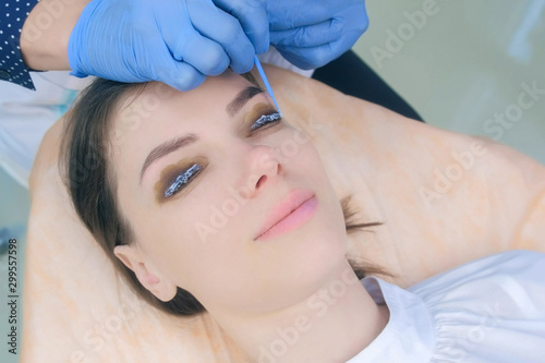 eyelash, lift, whipped, lifting, lamination, procedure, applying, solution, tool, woman, curler, eyelid, face, closeup, beauty, cosmetologist, beautician, cosmetology, salon, clinic, young, caucasian, indoor, lash, eyelash, female, hand, work, working, apply, cosmetic, fashion, glove, sterile, eye, eye, brunette