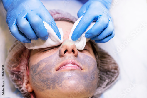 beautician washes off the face of a teneyger girl a multi-colored medical cosmetic mask, facial cleansing
