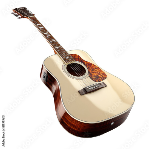 beautiful acoustic guitar with glossy finish and intricate details, showcasing its craftsmanship and design. warm tones of wood and elegant shape make it perfect instrument for music lovers
