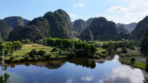 Beautiful aerial landscape of karst mountains in Ninh Binh, Vietnam.
