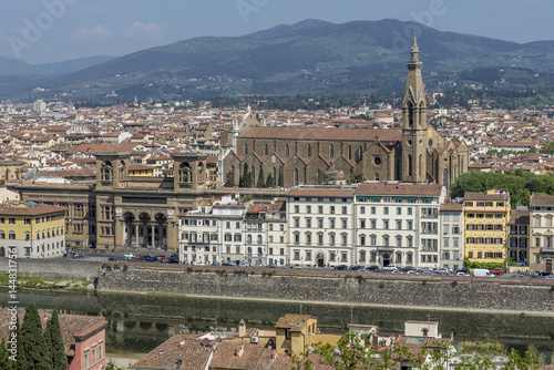 Beautiful aerial view of the Basilica of Santa Croce in the historic center of Florence, Italy, from Piazzale Michelangelo, on a sunny day