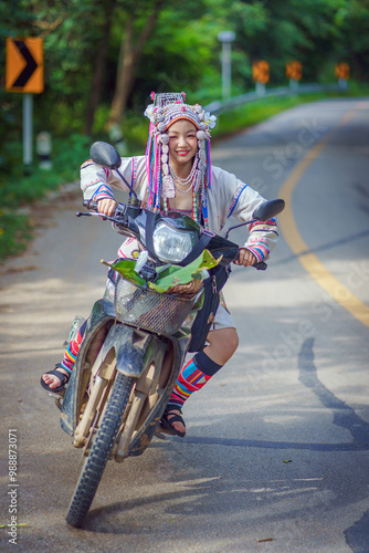 Beautiful Akha hill tribe girl wearing a traditional dress rides a motorbike happily on the road at the Thai Elephant Conservation Center, a tourist attraction in Lampang, Thailand.