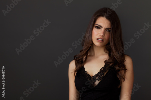 woman, girl, portrait, female, angry, anger, upset, pissed, expression, beautiful, pretty, lovely, attractive, young, adult, gorgeous, feminine, make-up, hair, brunette, standing, model, fashion, lace, glamour, caucasian, studio, grey