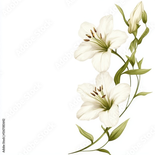 lily, flower, white, blossom, floral, green, foliage, nature, stem, elegant, botanical, delicate, bloom, plant, spring, summer, garden, decorative, illustration, artistic, graceful, serene, natural, drawing, artwork, isolated, detailed, beauty, vibrant, fresh, tender, realistic, graphic, growth, stamen, pistil, leaf, bud, tree branch, design, ornamental, purity, innocence, peaceful