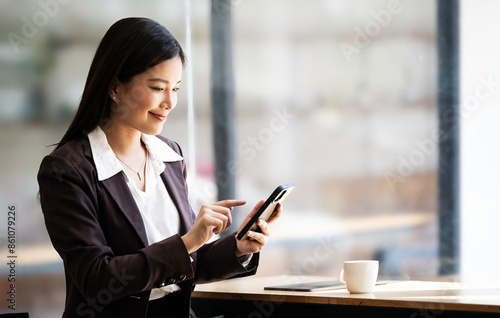 Beautiful asian businesswoman sit in the cafe, using smartphone and smiling. stock photo