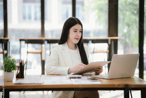 Beautiful Asian female accountant working with smartphone and laptop at her desk analyzing business reports and documents. Sending messages