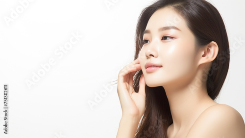 Beautiful asian girl model touching fresh glowing hydrated facial skin on whitw background. Beauty face. Skin care concept. Copy Space.