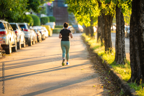 Beautiful asian sport active woman sprint run on city road morning sun light