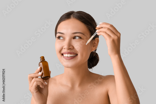 applying, asian, beautiful, closeup, light, serum, woman, adult, background, beauty, body, bottle, care, clean, colours, cosmetic, cosmetology, dermatology, dropper, eco, face, facial, female, girl, grey, happy, health, healthy, hygiene, lady, lifestyle, moisturise, natural, oil, organic, people, person, portrait, pretty, product, skin, smiling, smoothing, soft, therapy, treatment, wellness