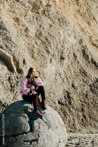 Beautiful asian woman sit on Moeraki Boulders, South Island, New Zealand.