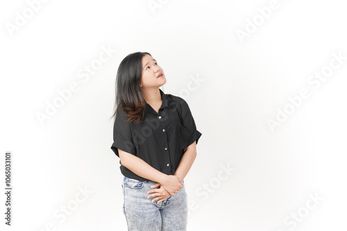 beautiful Asian woman stands in a thoughtful pose, lost in contemplation against a white background