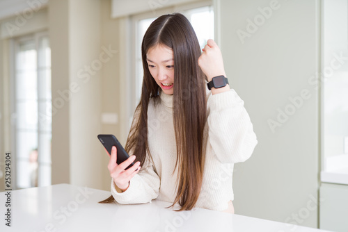 Beautiful Asian woman using smartphone annoyed and frustrated shouting with anger, crazy and yelling with raised hand, anger concept