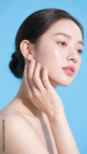 Beautiful Asian woman with perfect fresh skin touching her cheek gently. Beauty and skincare concept for cosmetic products on isolated blue background