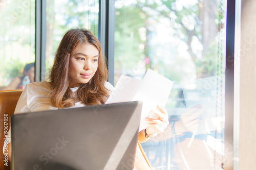beautiful asian young business woman sitting near transparent window and holding business document with laptop for her job at cafe or coffee shop. business success concept.