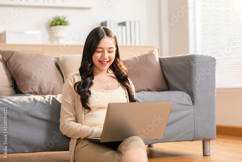 beautiful asian young woman wear casual sit on couch using computer laptop entertain with social media relax smile and laughing.Freelance woman working online sale marketing. Shopping online at home