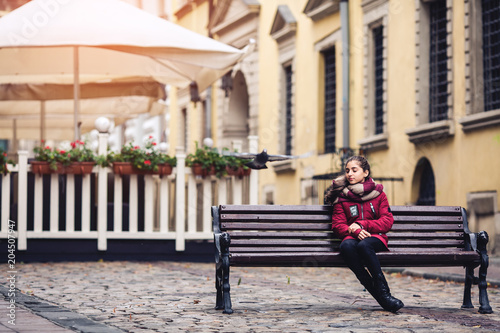 Beautiful autumn girl sitting on bench in middle of pavement on cafe background