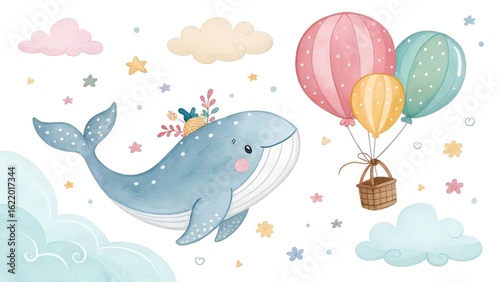 children, artistic, clip, colours, flying, gentle, graphic, infant, joyful, peaceful, playful, precious, stock, tender, vibrant, delightful, image, mammal, toddler, whale, whimsical, art, baby, balloon, fun, happy, illustration, lovely, pastel, watercolor, adorable, air, blue, calm, charming, cloud, composition, creative, cute, design, green, pink, red, sky, yellow, beautiful, sweet, marin