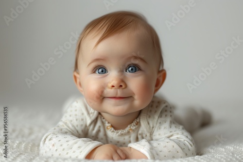 Beautiful baby girl with big blue eyes is lying on her tummy on a soft blanket, she is wearing a white bodysuit and is smiling