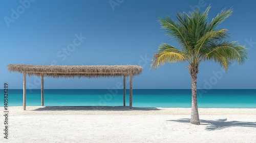 Beautiful beach view with azure water, a cabana, and a palm tree on bright sunny day
