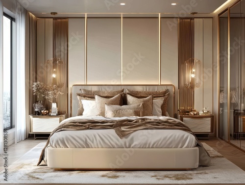 bedchamber, interior, luxury, elegant, modern, posh, bed, headboard, pillow, comfort, stylish, decor, design, bedding, carpet, room, wall, gold, gold, mirror, window, light, furniture, art, contemporary