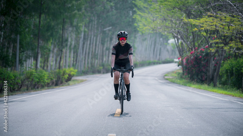 Beautiful biker wearing sport wear sunglass and helmet ride cyclist with her mountain bike in race adventure outdoor game competition on road, extreme healthy sport concept.