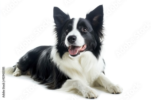 Beautiful black and white Border Collie, laying down side ways, mouth slightly open, looking towards camera, isolated on a white background , ai