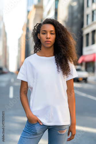 Beautiful black young woman in a white T-shirt mockup against the background of a city street. Full length front view of her showing off a blank t-shirt as a canvas for your design