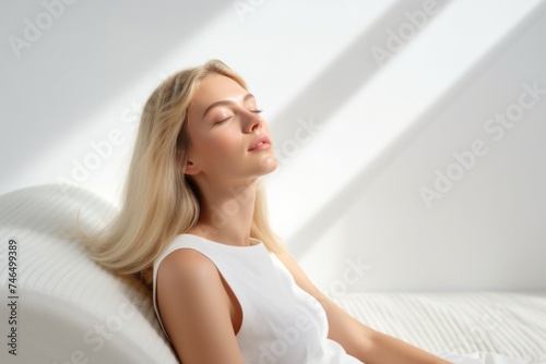 beautiful blond lady looking up and leaning on comfortable mattress against white wall at home