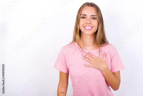 studio, white, blond, wall, caucasian, pink, background, woman, girl, standing, t-shirt, impressed, lifestyle, nice, feeling, gentle, reaction, confident, surprised, human, emotion, pleasure, facial, emotional, appearance, attractive, positive, feeling, smiling, people, photo, optimistic, excited, rejoicing, emotional, posing, teeth, joyful, expression, toothy, pleased, happy, smile, satisfied, delighted, cheerful, face