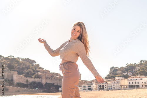 Beautiful blonde woman enjoying a sunny day in the beach walking in the sand with the arms opened, smiling looking at camera. 20-22 years old. White european woman.