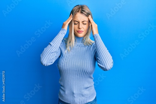 Beautiful blonde woman wearing casual clothes with hand on head for pain in head because stress. suffering migraine.