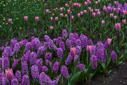 Beautiful blooming pink tulip and purple hyacinths on fields.