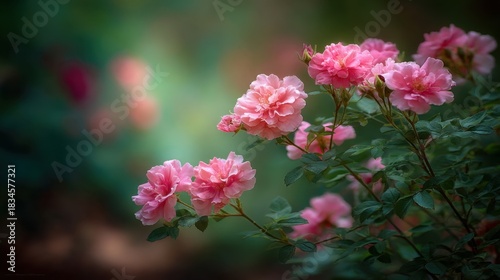 Beautiful blooming roses in garden with soft focus background showcasing vibrant pink petals and lush green leaves in serene natural setting