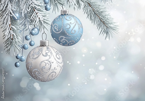 Beautiful blue and white Christmas ornaments hanging on frosted pine branches in a winter wonderland setting during the festive season