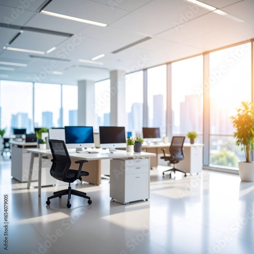 Beautiful blurred background of a light modern office interior with panoramic windows and beautiful lighting.