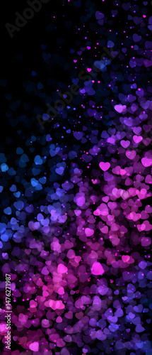 Beautiful bokeh effect small heart shapes in deep blue violet purple pink on black background perfect for fashion advertisement print and website banners