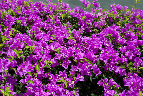 Beautiful bougainvillea flowers with green leaves