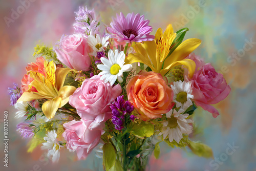 Beautiful bouquet of colorful flowers in a vase with a soft background