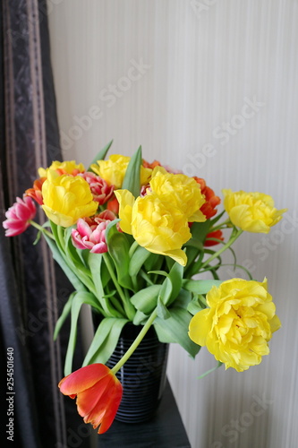 beautiful bouquet of spring flowers yellow and red tulips in a black vase