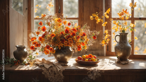 Beautiful bouquet with an antique vase on a table with autumn flowers against the background of a window