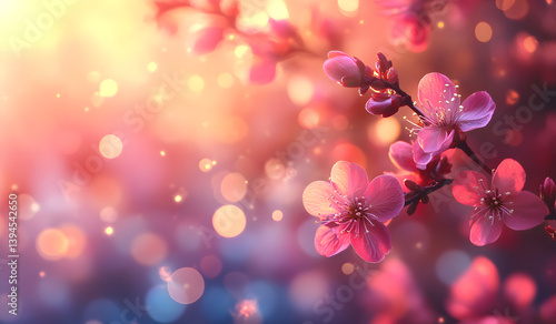 Beautiful branch of flowering apple tree in spring on light blue and pink background macro.