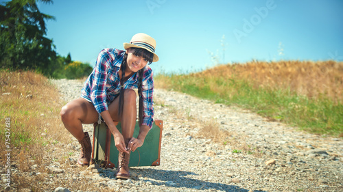 Beautiful brazilian woman with a suitcase on a road trip.