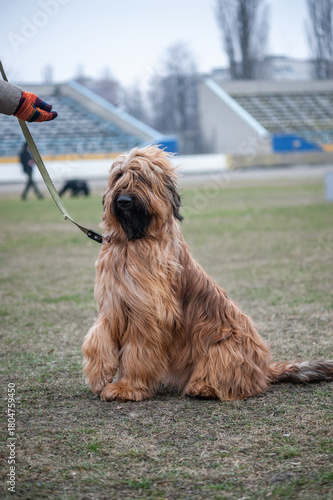 Beautiful Briard dog sits on grassy field during event at outdoor venue near city
