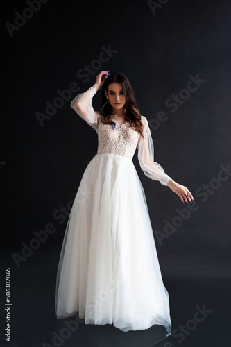 Beautiful bride perfect style. Wedding hairstyle make-up luxury wedding dress