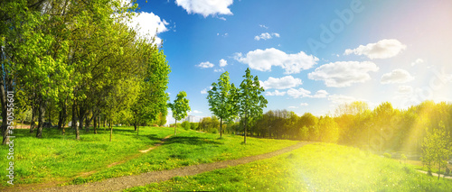 Beautiful bright colorful summer spring landscape with trees in Park and path, juicy fresh green grass on lawn and sunlight against blue sky with clouds. Wide format.